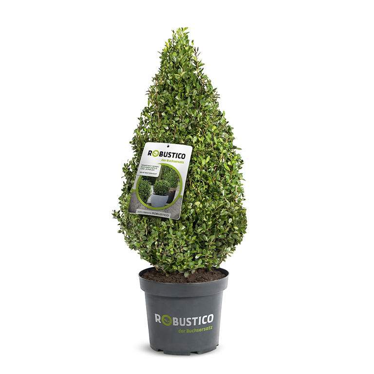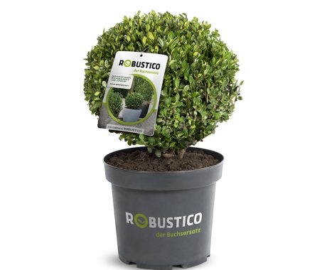 We recommend ROBUSTICO with its glossy, evergreen foliage. It looks like boxwood and also grows slightly faster and stronger. The name ROBUSTICO lives up to its promise, as this Ilex crenata is resistant to city climates, highly shade-tolerant, extremely winter-hardy, and, above all, resistant to the widespread aggressive boxwood diseases.